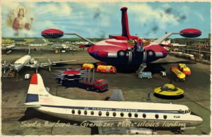 Idílicas postales antiguas con sabor a años 50 en las que se han filtrado alienígenas y platillos volantes; eso es “Invading The Vintage”, una serie del artista italiano Franco Brambilla.